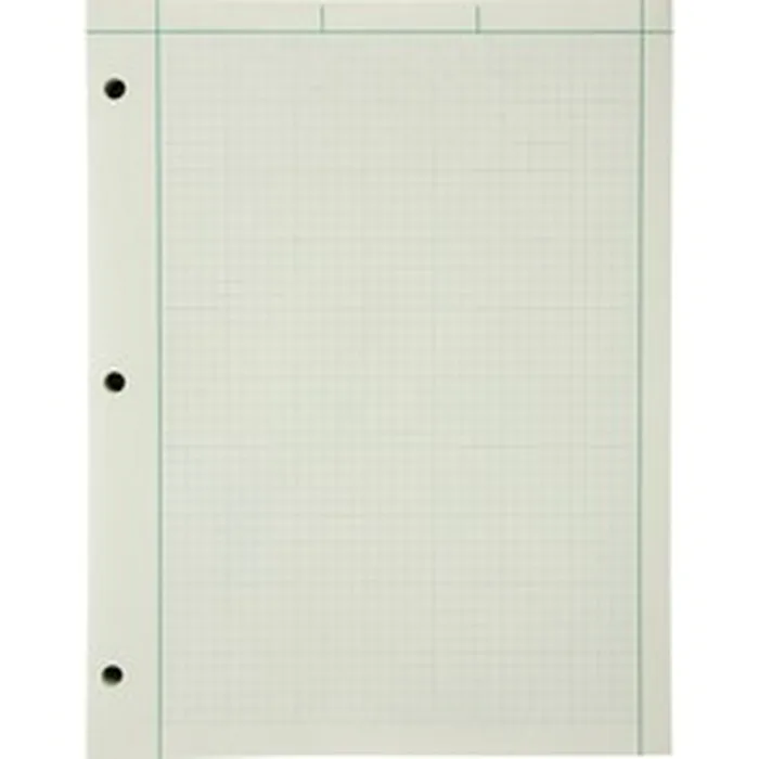 Engineers' quadrille pad features 15 lb. green tint paper that is printed on both sides. Front side is unruled with single margin lines at top and sides. Back side is printed with a cross-section grid of 5 squares per inch. Pad is three-hole punched to fit inside standard-size binders.