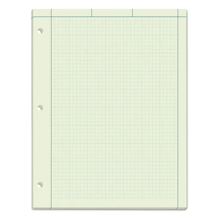 Computation pad features a 5-square-per-inch, cross-section ruling printed on back that faintly shows through to the front. Front is printed with frame margins. Design makes diagramming easier. Three-hole punched pad has holes drilled in the left margin to fit in three-ring binders and is glue-bound along that side. Eye-ease green tint paper reduces glare and eyestrain. Letter-size computation pad contains 200 sheets of 16 lb. paper and has a 27 point chipboard back for writing support.