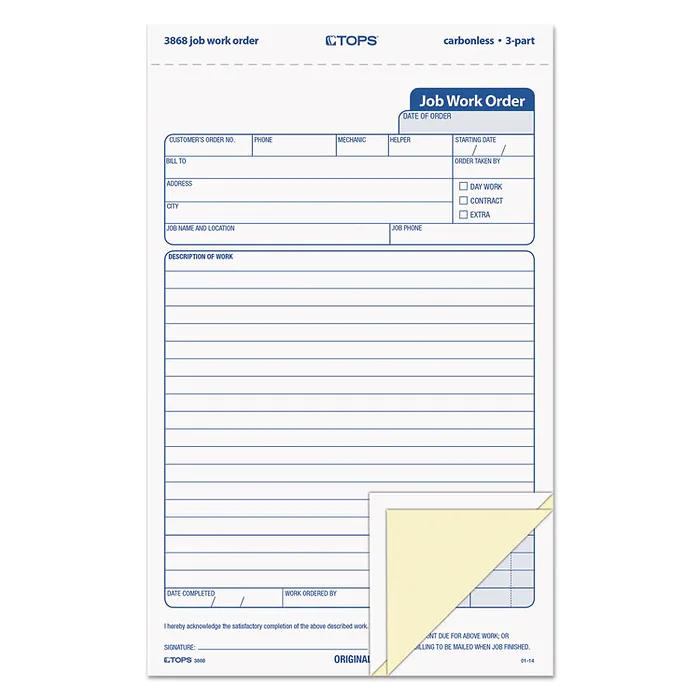 TOPS Carbonless 3-Part Job Work Order Forms - 3 PartCarbonless Copy - 5.50 x 8.50 Sheet Size - Assorted Sheet(s) - Black Print Color - 50 / Pack