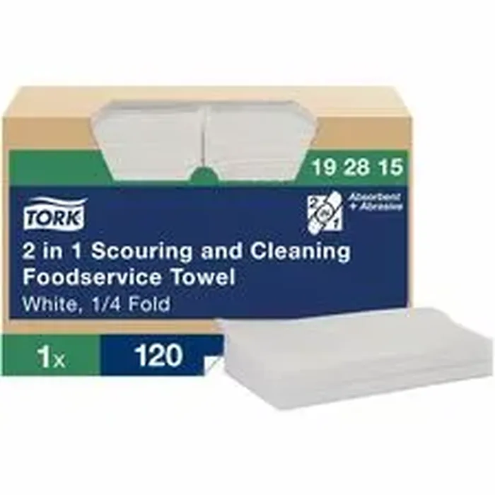 General InformationManufacturer:Svenska Cellulosa Aktiebolaget Manufacturer Part Number:192815 Manufacturer Website Address:http://www.sca.com Brand Name:Tork Product Name:2-in-1 Scouring/Cleaning Foodservice Towels Marketing Information:2-in-1 Scouring/Cleaning Foodservice Towels are abrasive and absorbent, helping you clean your facility more efficiently. Nonscratch wipers are reusable, allowing you to minimize waste by rinsing and reusing. Soft, flexible material targets even those hard-to-reach areas. They are perfect as an alternative to scouring sponges and pads.