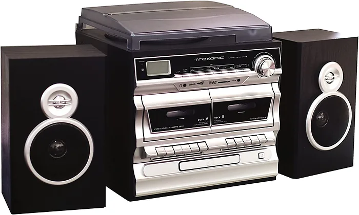 The stunning new turntable home stereo system from Trexonic will bring a sense of musical nostalgia to your home or office. The Trexonic 3-Speed Turntable With Single CD Player, Double Cassette Player, Wired Shelf Speakers, FM Radio & CD/USB/SD Recording blends seamlessly into your décor yet, adds a special touch of sophistication to your entertainment center. This compact yet powerful system will allow you to enjoy your favorite music from a wide range of media such as cassette's, vinyl record's, CD's, digitally recorded music from your USB Flash Drive, SD Card and content from your Bluetooth enabled devices.