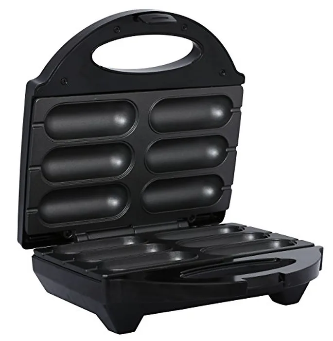 The powerful 750 watt Brentwood TS-601S Non-Stick 6 mini Corn Dog Maker cooks 3 perfect corn dogs in just a few minutes. Includes several delicious recipes. Corn dogs slide right off of the easy to clean non-stick plates. Convenient power/heat indicator lights. Stores upright for compact storage. Features overheat safety shutoff.