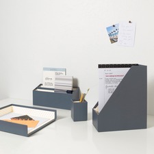 Keep organized in style with the Paper Wrapped Desk Organization collection. Papers and files can be neatly stored in the paper tray and magazine holder. Storage bin offers a convenient spot for your journal, phone or notebook. Pencil cup keeps any other tools out of the way while staying within reach. Constructed of 3mm chipboard and wrapped in premium-coated paper, all materials are responsibly sourced and FSC certified. Sturdy yet lightweight set includes a coordinating pencil cup, paper tray, magazine holder and storage bin.