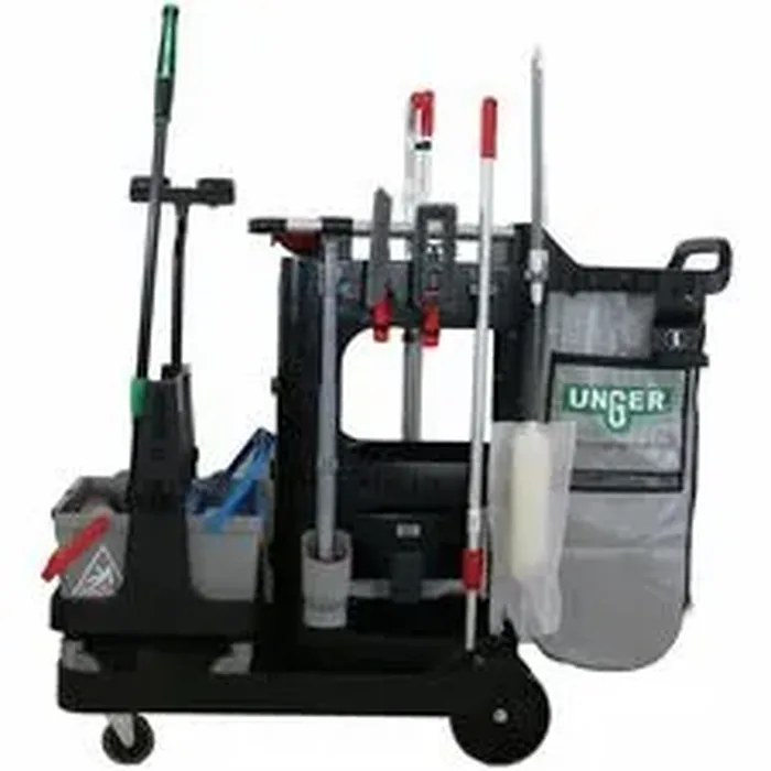 RestroomRx and OmniClean System Combined in one! A fully-loaded janitorial cart that comes with everything needed to clean restrooms. This turnkey and organized RestroomRx Cart features the Unger Excella Straight Pole.
