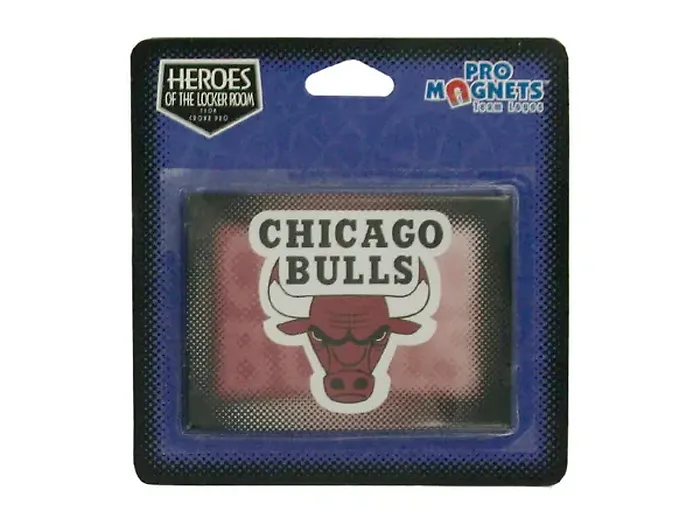 The magnet features the classic Bulls logo, ensuring it stands out. Each magnet comes packaged on a blister card with a convenient hanging hole for easy display.