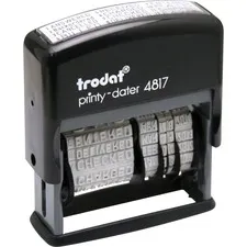 Eco-friendly five-in-one date stamp offers a quick, versatile way to stamp documents with the date only or with the date and four interchangeable key phrases. Self-inking dater delivers rapid, repeat impressions of the words ENTERED, FAXED, PAID or RECEIVED in blue uppercase letters, the date in red and a blue line so you can write in your name. Impression size is 1" x 1-5/8". Four-band date includes months, days and 10 years. The date band cover ensures fingers remain clean. Stamp delivers up to 10,000 impressions and contains a high percentage of recycled material. The frame is made of plastic.