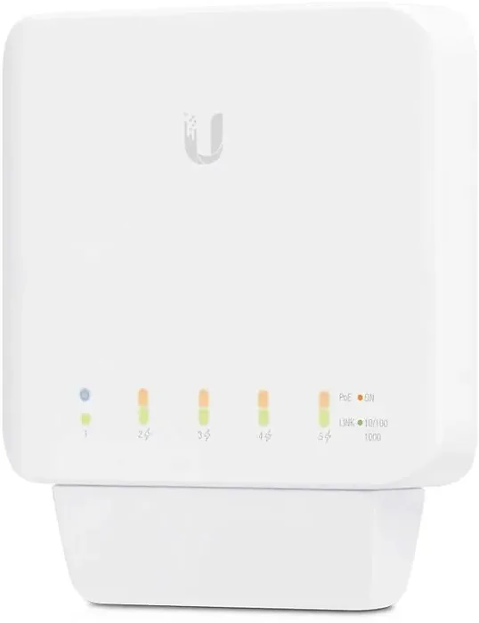 The UniFi Flex Switch is a versatile 5-port managed PoE switch designed for seamless integration in any networking environment. It features one (1) 802.3at/bt (PoE+/PoE++) input port and four (4) 802.3af (PoE) Gigabit Ethernet ports, providing both power and connectivity for your devices.