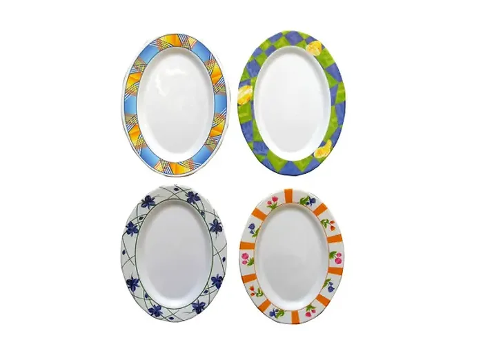 Enhance your dining experience with these large melamine oval plates, available in four assorted designs. Perfect for serving meals or as elegant platters for gatherings, these plates are both stylish and practical. Each plate measures nearly 12 inches in diameter, making them ideal for serving everything from chicken roasts to festive meals. Crafted from durable melamine, you can trust that these plates will withstand the hustle and bustle of kitchen activity.