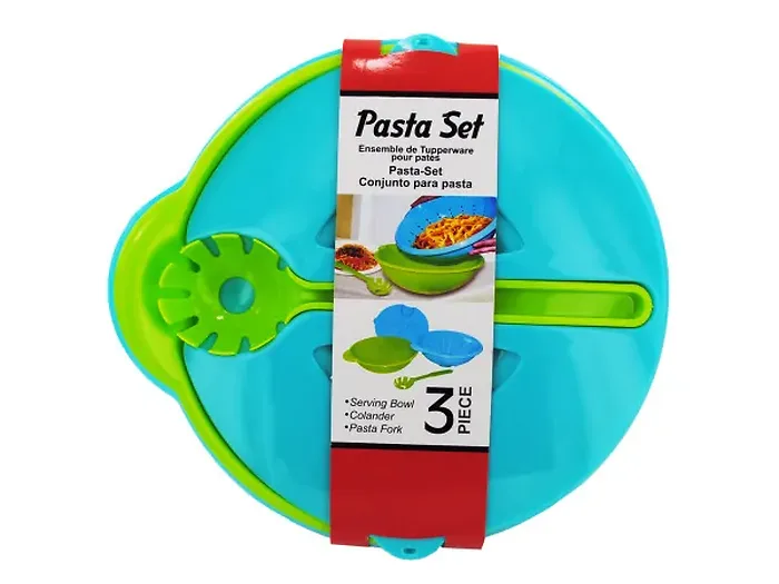Make pasta night effortless with this 3-piece pasta set. It includes a spacious serving bowl, a convenient colander for draining, and a handy pasta fork for easy serving. Designed for easy storage, all pieces nest together, saving space in your kitchen. The vibrant green and blue colors add a fun touch to your dining experience, and being made of durable plastic ensures they will last for many meals to come.