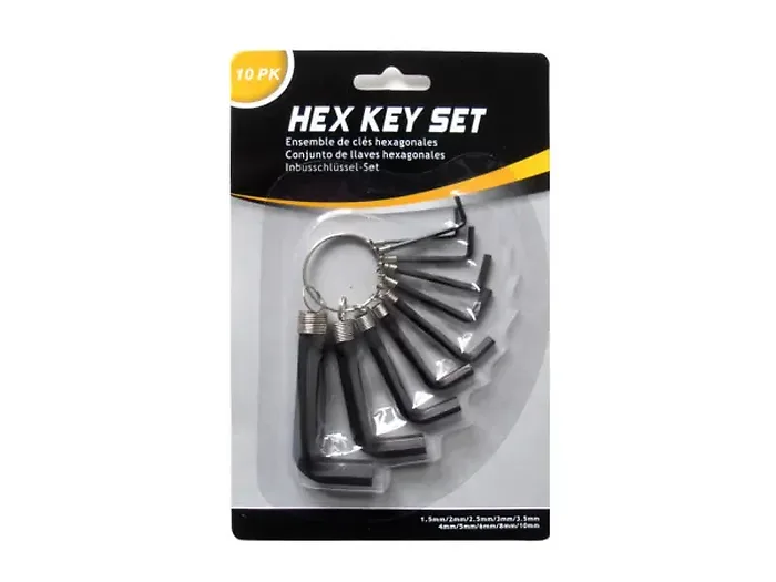 This 10-piece hex key set is perfect for all your fastening needs. Each key is crafted from sturdy metal, ensuring longevity and reliability. The set comes neatly organized on a convenient ring for quick access and storage. Whether you're a professional or a DIY enthusiast, this hex key set is an essential addition to your toolkit.