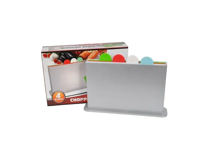 This versatile chopping board set includes four distinct boards, each designed to cater to different food types. They're neatly stored in a convenient storage box, making it easy to keep your kitchen organized. Each board is clearly marked, allowing cooks to choose the appropriate one for meats, vegetables, or other food items. Crafted from durable plastic, these boards measure 13" x 9" x 3" and are built to withstand the rigors of daily cooking.