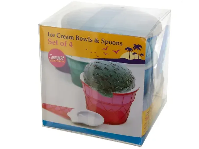 Delight in the joy of ice cream with our whimsical Colorful Ice Cream Cone Bowls and Spoons Set. Perfect for any ice cream party or a cozy treat at home, these bowls are designed to mimic ice cream cones, featuring a vibrant exterior in assorted colors like blue and pink. The inside is a clean white, enhancing the look of your favorite dessert. Each bowl measures approximately 3.75 inches in diameter and stands 2.5 inches high, making it an ideal size for serving up generous portions of ice cream. The set also includes matching spoons that are 4.5 inches long, adding to the fun and convenience of your ice cream experience.
