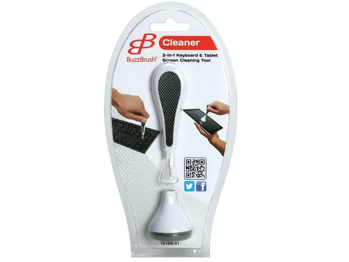 The BuzzBrush Dual Action Cleaner is your go-to solution for maintaining the cleanliness of your keyboard and tablet screens. This innovative 2-in-1 tool features a gentle flat base designed specifically for screen cleaning and a bristle brush located in the handle for effectively reaching in between keyboard keys.