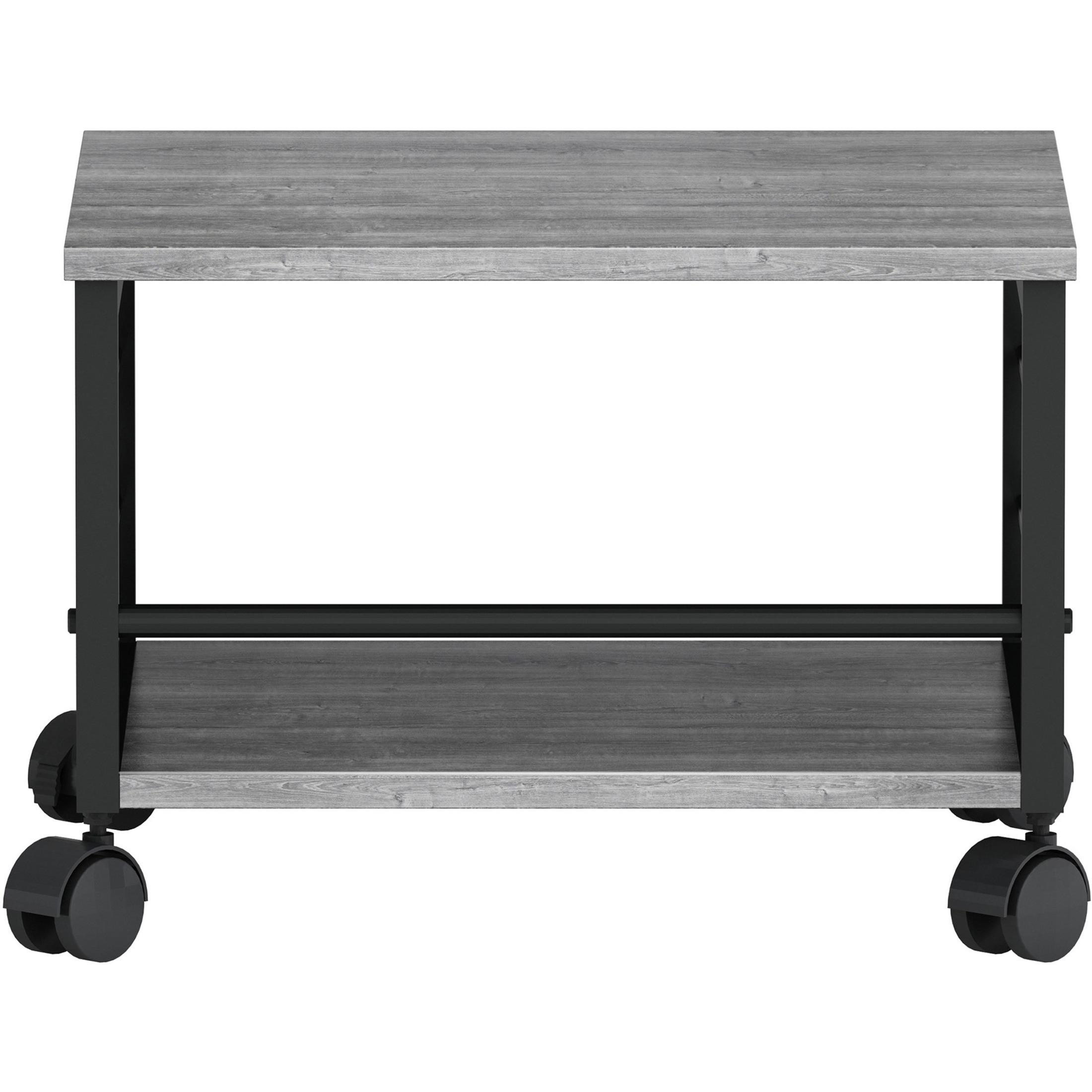 With durable steel and wire construction, versatile machine stand is sturdy enough to hold a printer, fax machine or personal copier. Two convenient openings let you route cords/cables and use them as a handle to pull stand from beneath worksurface. Easy-to-assemble, underdesk machine stand rolls easily on four twin-wheel casters (two locking).