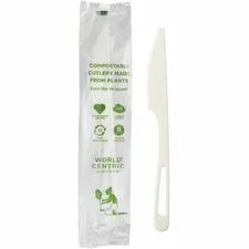 World Centric® compostable 6" knife, fork and spoon cutlery is made from 70% non-GMO plastic and 30% talc, and include a napkin. The outer wrapping is also compostable. These compostable utensils are designed to reduce waste and provide a safe, non-toxic alternative to plastic. These utensils are certified compostable, dishwasher safe, and can be reused at least 100 times, at which point they can be composted in a commercial compost facility and will break down within 90 to 180 days. Home composting is not advised for this compostable cutlery, as they do require a higher heat to break down. The cellulose wrapper is also certified compostable.
