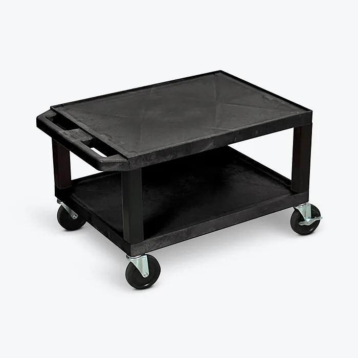 This 16"-high rolling AV cart offers two 1.5" thick shelves to support and transport audio/video equipment and more. Both shelves offer a textured surface and a .25" retaining lip to help contain contents, and are made from molded plastic that won't chip, warp, scratch, rust or peel. Square legs provide sturdy support and four 4" heavy-duty casters (two with locking brake) allow for easy mobility.