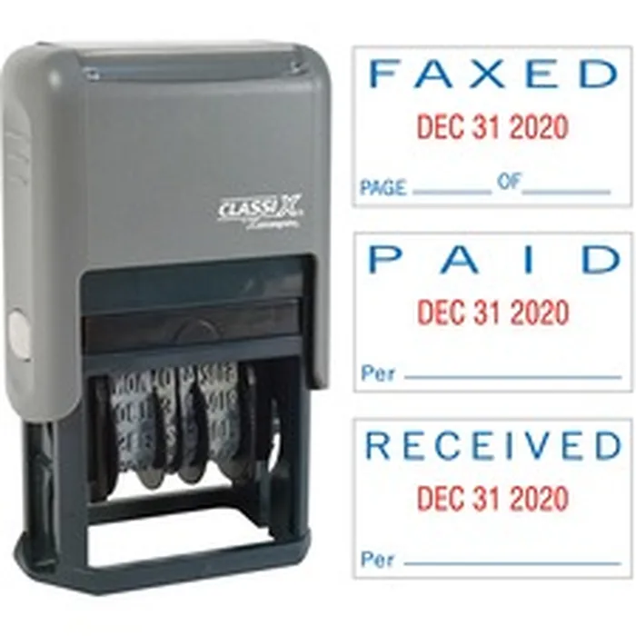 Plastic, self-inking, message date stamp delivers three popular phrases: PAID, FAXED and RECEIVED. Frame copy prints in blue; month, day and year print in red. Date band ranges 12 years. Impression size is 15/16" x 1-3/4".