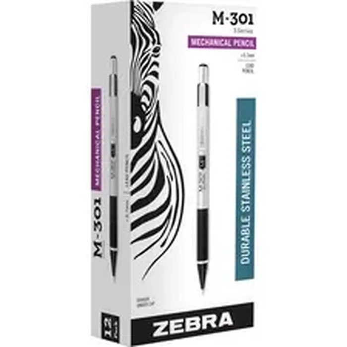 General InformationManufacturer:Zebra Pen Corporation Manufacturer Part Number:54310 Manufacturer Website Address:http://www.zebrapen.com Brand Name:Zebra Product Line:Steel Product Series:3 Product Model:M-301 Product Name:STEEL 3 Series M-301 Mechanical Pencil Marketing Information:Mechanical pencil features a lightweight yet durable stainless steel barrel with a nonslip grip. Use the secure metal pocket clip for easy storage and accessibility. Mechanical pencil offers a replaceable eraser with Zebra's 83211 and is refillable with standard lead. Original Stainless Steel in a Mechanical Pencil, the M-301 is perfectly portable, steel mechanical pencil with secure metal clip guarantees so your pencil will be there when you need it. It combines style, strength and value. Lightweight yet durable stainless steel barrel features a nonslip grip. Mechanical pencil is refillable with standard lead.