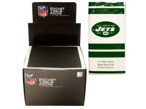 Show your team spirit with the New York Jets NFL Pocket Tissues! These small, resealable packs are perfect for on-the-go use and feature vibrant team artwork that showcases your loyalty. Each compact pack measures approximately 4" x 1" x 2" and contains 15 soft, 2-ply plain white tissues. With a sheet size of 8" x 8", they are both functional and stylish. The countertop display holds a total of 48 packs, making it an ideal choice for events, parties, or everyday use.