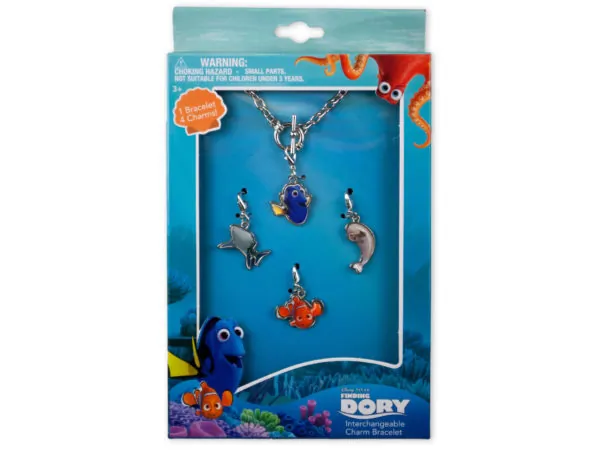 Take Dory and friends on your everyday adventures with this enchanting Disney / Pixar Finding Dory Charm Bracelet. This delightful set includes one charming bracelet and four interchangeable charms featuring Dory, Nemo, Destiny, and Bailey.