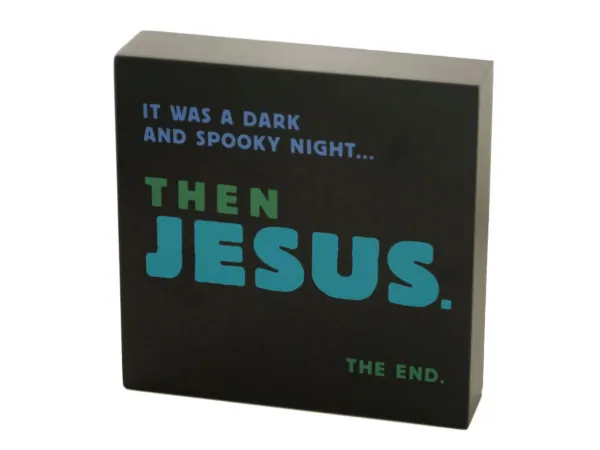 Add a touch of inspiration to your decor with this Then Jesus Inspirational Mini Box Wall Art. Crafted from a sleek black wooden box, it features the uplifting phrase, "It was a dark and spooky night... then Jesus. The end." adorned in calming shades of lavender, soft green, and light blue.