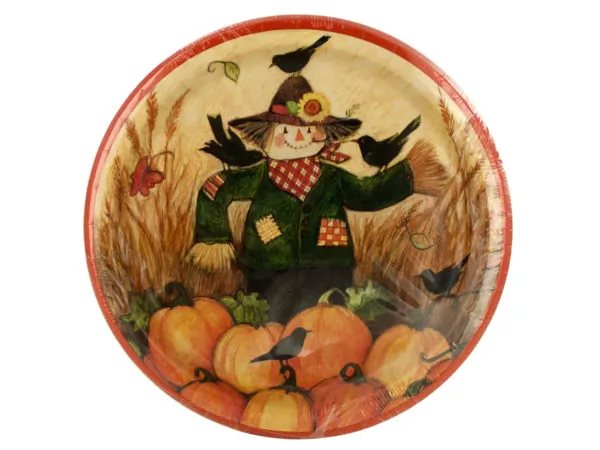 Add a touch of seasonal charm to your gatherings with the Autumn Harvest Scarecrow Dinner Plate Set. This 8-piece collection features sturdy coated paper plates adorned with a delightful design depicting a scarecrow amidst a backdrop of vibrant pumpkins, colorful leaves, and playful blackbirds. The recessed design not only makes the plates easy to hold but also helps prevent spills, making them perfect for any autumn celebration. Each plate measures approximately 8-3/4 inches in diameter and comes shrink wrapped for convenience.