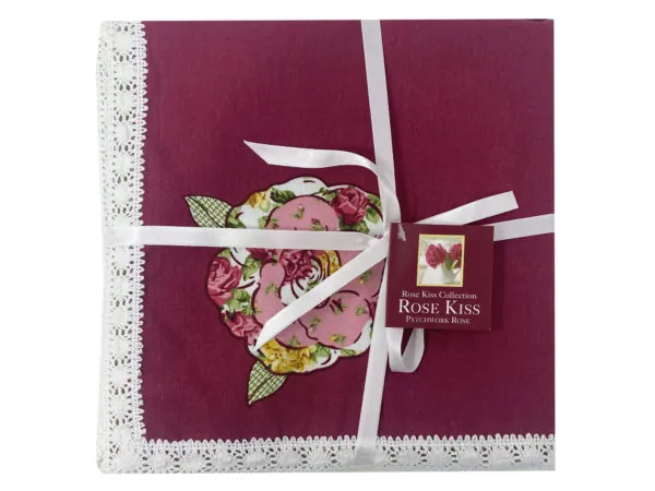 Elevate your dining experience with this set of Elegant Rose Print Cloth Napkins. Designed to enhance any tablescape, these reusable napkins feature a vibrant rose design on a rich burgundy background, complemented by an embroidered doily edge.