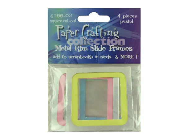Enhance your paper crafting projects with these charming pastel-colored metal rim slide frames. Perfect for showcasing pictures or adding a vibrant touch to your scrapbook pages, each frame beautifully surrounds your chosen elements with a stylish silver border.