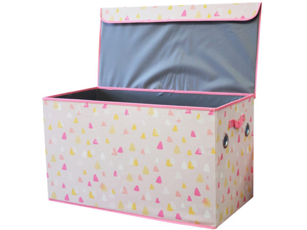 Extra Large Pink Triangle Pattern Collapsible Storage Box 14.5" x 28" x 15.75" This Extra Large Pink Triangle Pattern Collapsible Storage Box perfectly keeps your living spaces organized and aesthetically pleasing while holding a wide range of items. The generous 28.5" x 14.5" x 16" size is perfect for storing blankets, towels, cushions, books, toys, seasonal clothing, and more! This home essential easily opens with a sturdy bottom, folding top with magnetic lid, and side handles for easy carrying. Folds down and out of the way when not in use. The inside features a nylon material, while the outside is made of light pink canvas with an all-over pink/yellow/white pattern and pink trim. Comes packaged collapsed inside poly bag with insert label measuring approximately 16" x 1" x 27".