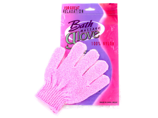 Great for relaxation, this Bath Massage Glove soothes and gently exfoliates skin to feel fresh and healthy. Gloves are made with 100% nylon. Come in assorted colors. Fits most hands. Each glove is packaged in a hanging poly bag. Bath Massage Glove Great for relaxation, this Bath Massage Glove soothes and gently exfoliates skin to feel fresh and healthy. Glove is made with 100% nylon. Comes in assorted colors. Fits most hands. Comes packaged in a hanging poly bag.