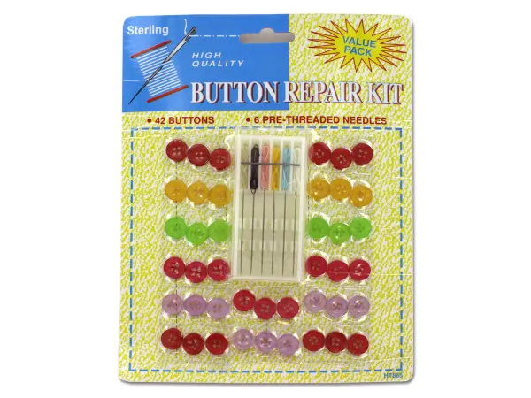 This comprehensive button repair kit is perfect for a variety of applications including sweaters, blouses, and polos, and is also ideal for doll making or other creative projects. Fixing fashion emergencies is simple and stress-free with our six pre-threaded needles. The kit includes 42 round four-hole plastic buttons in an assortment of vibrant colors such as blue, lavender, orange, red, and yellow.