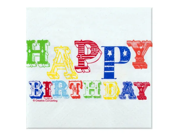 Make your birthday celebration unforgettable with our circus themed napkins. Each napkin showcases a vibrant design featuring "Happy Birthday" in fun, colorful lettering, adding a festive touch to your party decor.