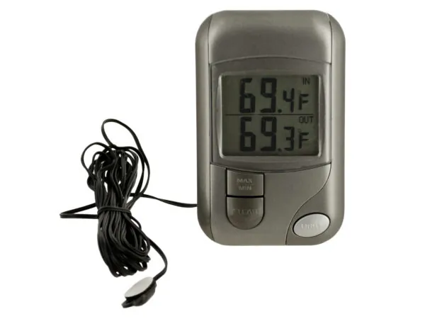 Monitor the temperature with ease using our Digital Indoor Outdoor Thermometer. This sleek thermometer features a dark silver plastic design that includes a digital display for easy reading. It is equipped with a sensor cord and a convenient backlight that allows for visibility in low light conditions.