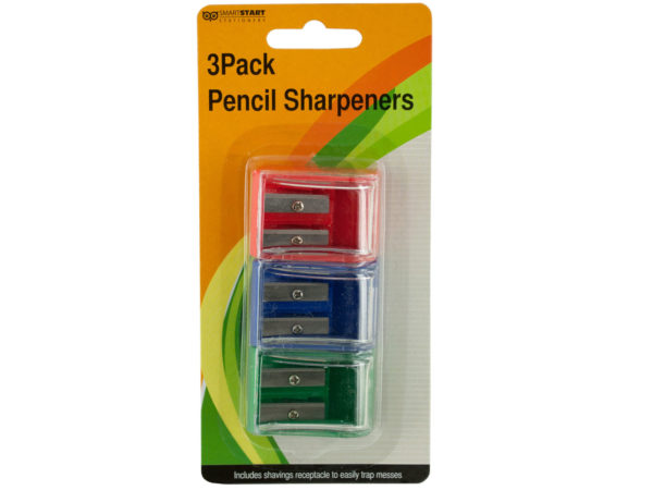 Great for home, school and office, this 3-piece Dual Hole Pencil Sharpeners Set features durable, compact plastic sharpeners with sharp metal blades and easy-view shavings receptacles. Sharpeners have two holes for standard and larger pencils. Comes packaged in a blister pack.
