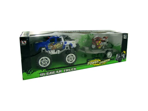 Get ready for adventure with the Friction-Powered Big Wheel Pickup Truck and Motorcycle Set. This vibrant toy truck features a fierce bulldog design and comes with a detachable trailer that carries a speedy red racing motorcycle.