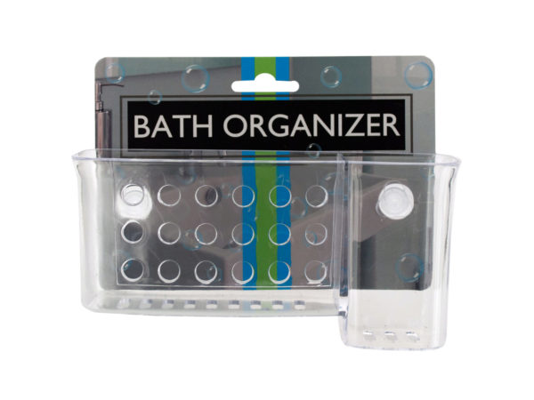 Keep your sink or shower organized with this convenient bath organizerTransparent plastic holder with large and small sectionsCircle cutout design on the frontSlotted drainage holes on the bottomTwo strong suction cups on the back for easy mountingMade from plasticTransparent color6.25 in. L x 2.12 in. W x 3.12 in HWeight: 0.38 lbs. Bath Organizer with Suction Cups Keep your sink or shower organized with this convenient Bath Organizer featuring a transparent plastic holder with large and small sections, a circle cutout design on the front, slotted drainage holes on the bottom and two strong suction cups on the back for easy mounting. Organizer is easy to clean and made of durable plastic. Measures approximately 6.25" x 2.125" x 3.125". Comes packaged with a hanging panel.