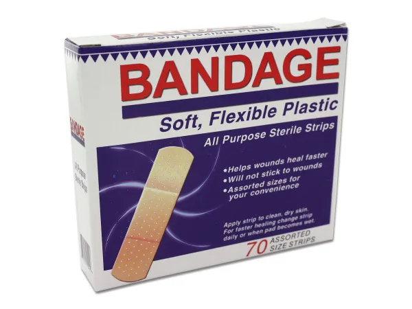 Ensure your first aid kit is well-equipped with our assorted flexible plastic bandages. This box includes 70 strips in various sizes, designed to meet your needs for minor cuts and scrapes. Made from high-quality materials, these bandages offer exceptional comfort and protection.