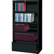 Receding lateral file with roll-out shelves offers a total of five drawers with heavy-duty, three-piece, ball-bearing slide suspension for smooth drawer movement. All drawers above the bottom one have receding fronts and roll-out shelves for easy access to your files. Bottom drawer has a fixed front. The top two shelves feature roll-out binder storage. Included hangrails accommodate side-to-side filing of letter, legal or A4-size folders. Dual lock bars secure both ends of drawers. Interlock system prohibits the extension of more than one drawer at a time. 36" wide lateral file also features a core-removable lock; full-width designer drawer pulls; four adjustable leveling guides for stabilization and reinforced double-base construction. Lateral file does not include dividers. File meets/exceeds applicable ANSI/BIFMA standards.