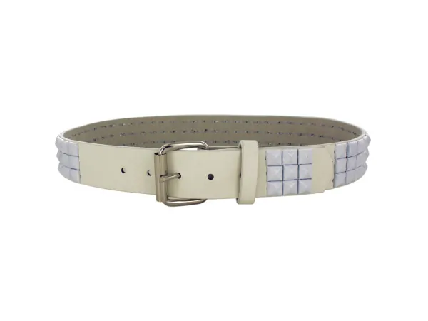 The belt is beautifully embellished with three rows of striking white painted metal studs, adding a unique flair to any outfit. The secure silver metal buckle ensures a comfortable fit.