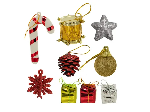 The ornaments are conveniently packaged inside a hanging poly bag. Measurements range from approximately 3/4" to 2 3/4".