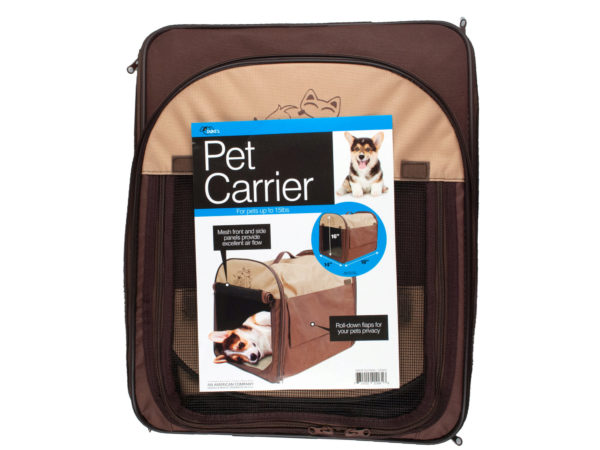 Comfortably transport your cat or small dog with this sturdy Pet Carrier Bag featuring reinforced nylon and plastic construction with mesh front and side panels to provide excellent air flow and roll down flaps for your pet's privacy. For pets up to 15 pounds. Measures approximately 16" x 14" x 18". Comes packaged in a poly bag.
