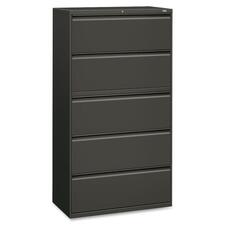 Five-drawer lateral file offers clean lines, reinforced case construction, dual side locks for security, and full-width, designer-style handles. Baked enamel finish over rust-inhibiting, phosphate pretreatment adds more durability. Three-part, telescoping, ball-bearing suspension delivers smooth drawer operation. Charcoal lateral file includes four fixed drawers, and the top drawer is a roll-out shelf with a receding flipper door. Ideal for binders, end-tab files, standing files or supplies. Drawers accommodate letter-size or legal-size folders from side-to-side with included adjustable hangrails. Drawers are flush at the top and sides and feature drawer-extension restraint. Mechanical interlock allows only one drawer to open at a time. Lateral file also offers four adjustable leveling guides for stabilizing and HON One Key interchangeable, core-removable lock. Lock mechanism secures both sides of drawers.