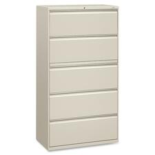 Five-drawer lateral file offers clean lines, reinforced case construction, dual side locks for security, and full-width, designer-style handles. Baked enamel finish over rust-inhibiting, phosphate pretreatment adds more durability. Three-part, telescoping, ball-bearing suspension delivers smooth drawer operation. Light gray lateral file includes four fixed drawers, and the top drawer is a roll-out shelf with a receding flipper door. Ideal for binders, end-tab files, standing files or supplies. Drawers accommodate letter-size or legal-size folders from side-to-side with included adjustable hangrails. Drawers are flush at the top and sides and feature drawer-extension restraint. Mechanical interlock allows only one drawer to open at a time. Lateral file also offers four adjustable leveling guides for stabilizing and HON One Key interchangeable, core-removable lock. Lock mechanism secures both sides of drawers.