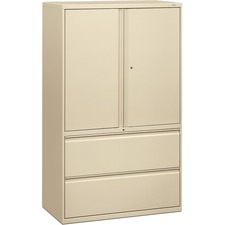 Lateral file with cabinet storage features locking hinged doors with bevel pulls and two adjustable shelves that adjust in 2" increments. Inside height of cabinet is 36-1/4". Bottom of cabinet has two lateral file drawers with full-width bevel pulls, steel ball-bearing suspension, and adjustable hangrails for side-to-side letter-size/legal-size filing. "One-Key" core-removable locks on door and on file lock independently. Lateral file has four adjustable leveling guides. File is certified by SCS to be in compliance with specific, indoor, air-quality emission requirements and meets or exceeds applicable ANSI/BIFMA standards.