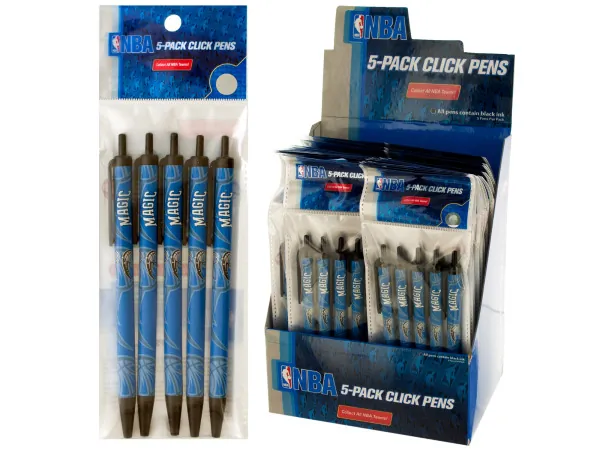 Show your support for the Orlando Magic with this official NBA licensed click pen display. Each pack includes 5 click pens featuring the team's logos, designed for fans of all ages. The pens are perfect for everyday use, boasting smooth black ink for a seamless writing experience.