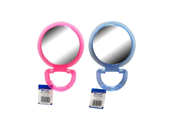 This compact double-sided mirror offers the best of both worlds with a standard view on one side and a magnified view on the other. Perfect for applying makeup, checking hairstyles, and more, it features a convenient folding handle for easy portability. Available in vibrant blue and pink colors, each mirror measures 9" x 6".