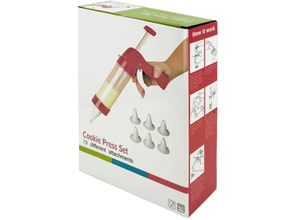 The set includes a sturdy plastic and metal plunge trigger tool, along with 19 different attachments, featuring 13 disks for cookie designs and 6 nozzles for icing. All components are dishwasher safe for easy cleaning, and you'll find clear instructions printed on the side of the package.