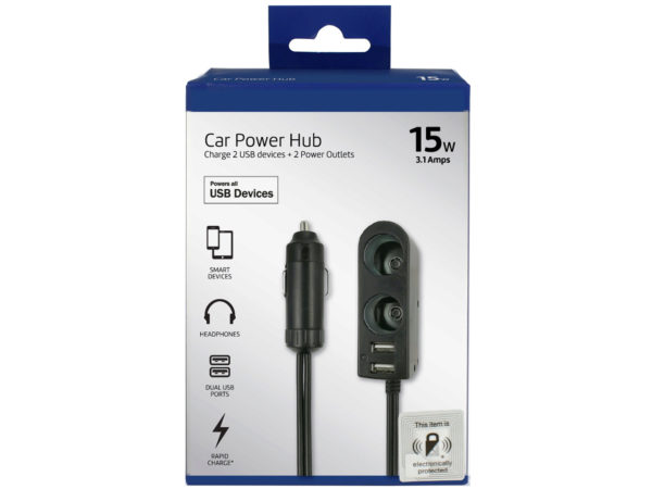 New Tech 15W Car Power Hub with 2 USB Ports & 2 Car Outlets Keep charged while on the go with this convenient 15-Watt Car Power Hub! It Features 2 USB outlets with combined 3.1 amps and 2 outlets to connect additional portable electronic devices. The 3-foot power cord provides access to everyone in the vehicle. Charge with confidence! The built-in safety circuits prevent overcharging and spikes from your car. Plug this electronics essential into your car's lighter port for instant charging while running errands, on road trips, or for everyday use. The Rapid Charge works with 1 USB device connected and can charge 40% faster than 5W/1AMP car charger. Comes packaged inside a color hanging box.