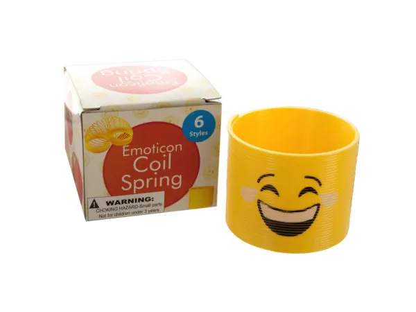 Emoticon Coil Spring Emoticon Coil Spring Provide hours of fun for children and adults with this Emoticon Coil Spring featuring a classic spring toy made of yellow plastic with the design of commonly used keyboard expressions. Learn tricks and amaze friends! Makes a great party favor and stocking stuffer. Measures approximately 2.5" long x 3" in diameter when stacked. Coil comes in 6 assorted styles. Comes packaged in an individual box. Box measures approximately 3" x 3" x 2.625".