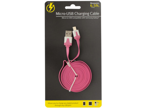 Quickly power or synchronize your phone with this Samsung Galaxy USB Charge & Sync Cable featuring a durable flat plastic cord with standard and micro USB connectors. Simply connect to a computer or power adapter. Comes in assorted colors. Measures approximately 6.5' long. Compatible with Samsung Galaxy. Comes packaged in a blister pack.